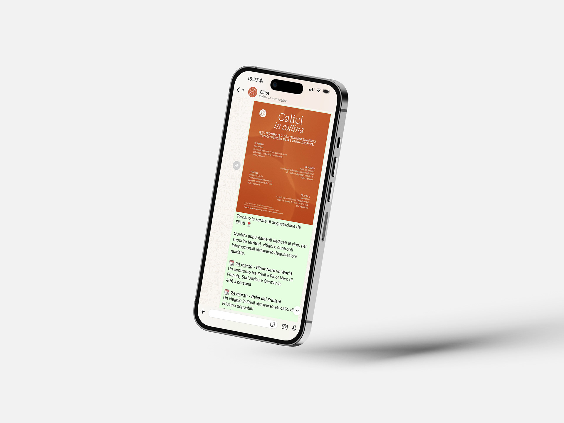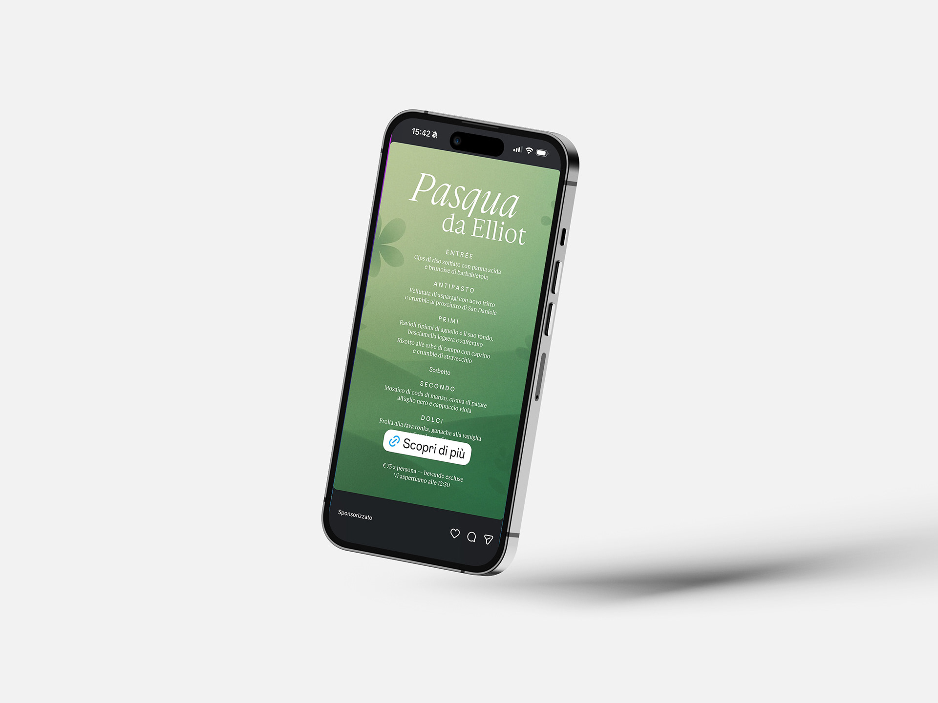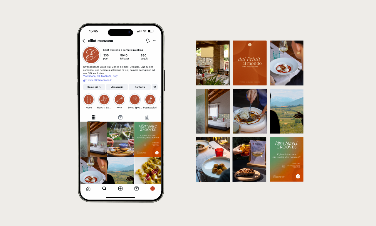 Elliot è una realtà di ristorazione e ospitalità situata nei Colli Orientali del Friuli. Mi occupo della comunicazione visiva a 360°, curando social media, materiali stampati e contenuti multimediali.