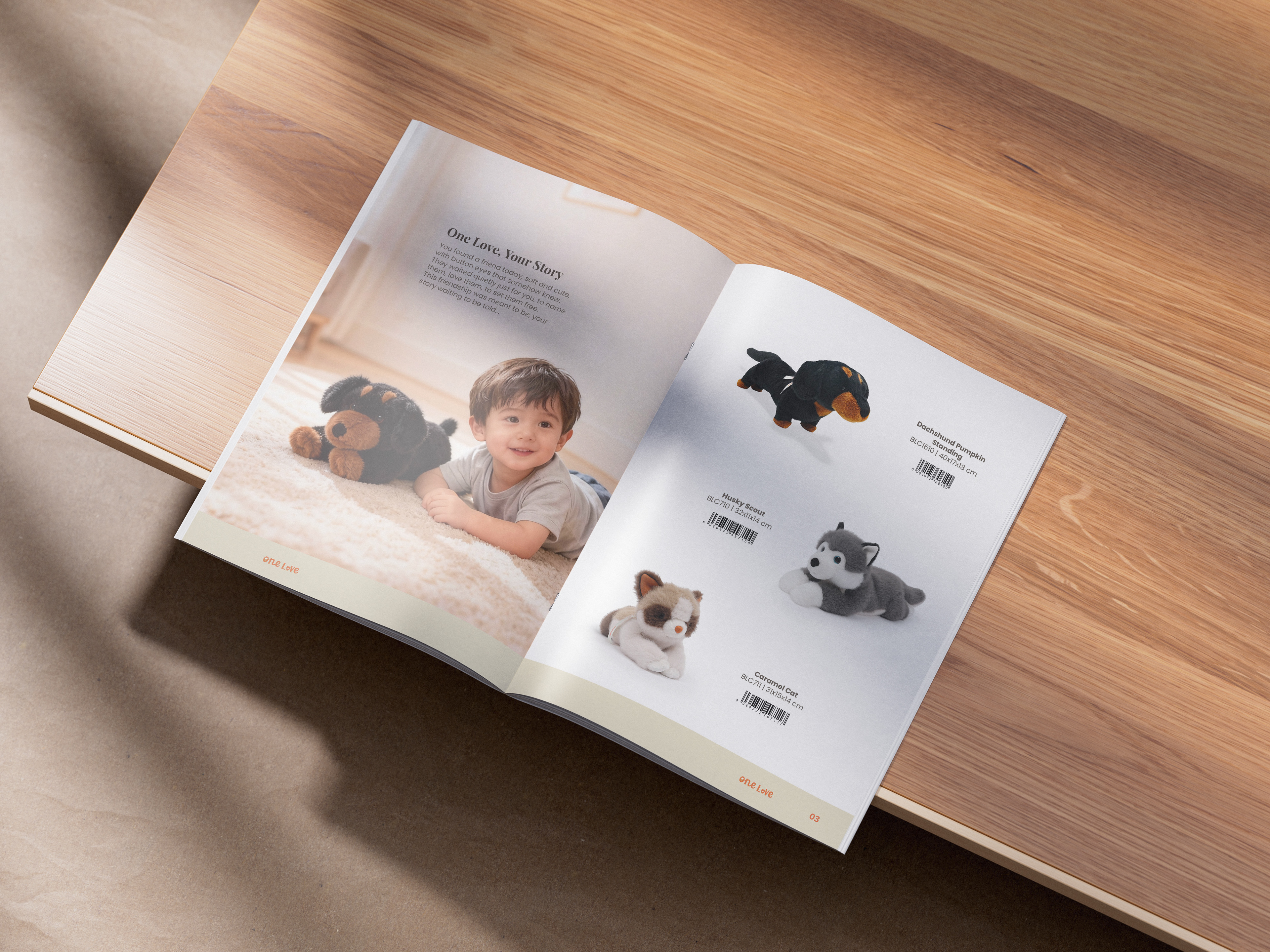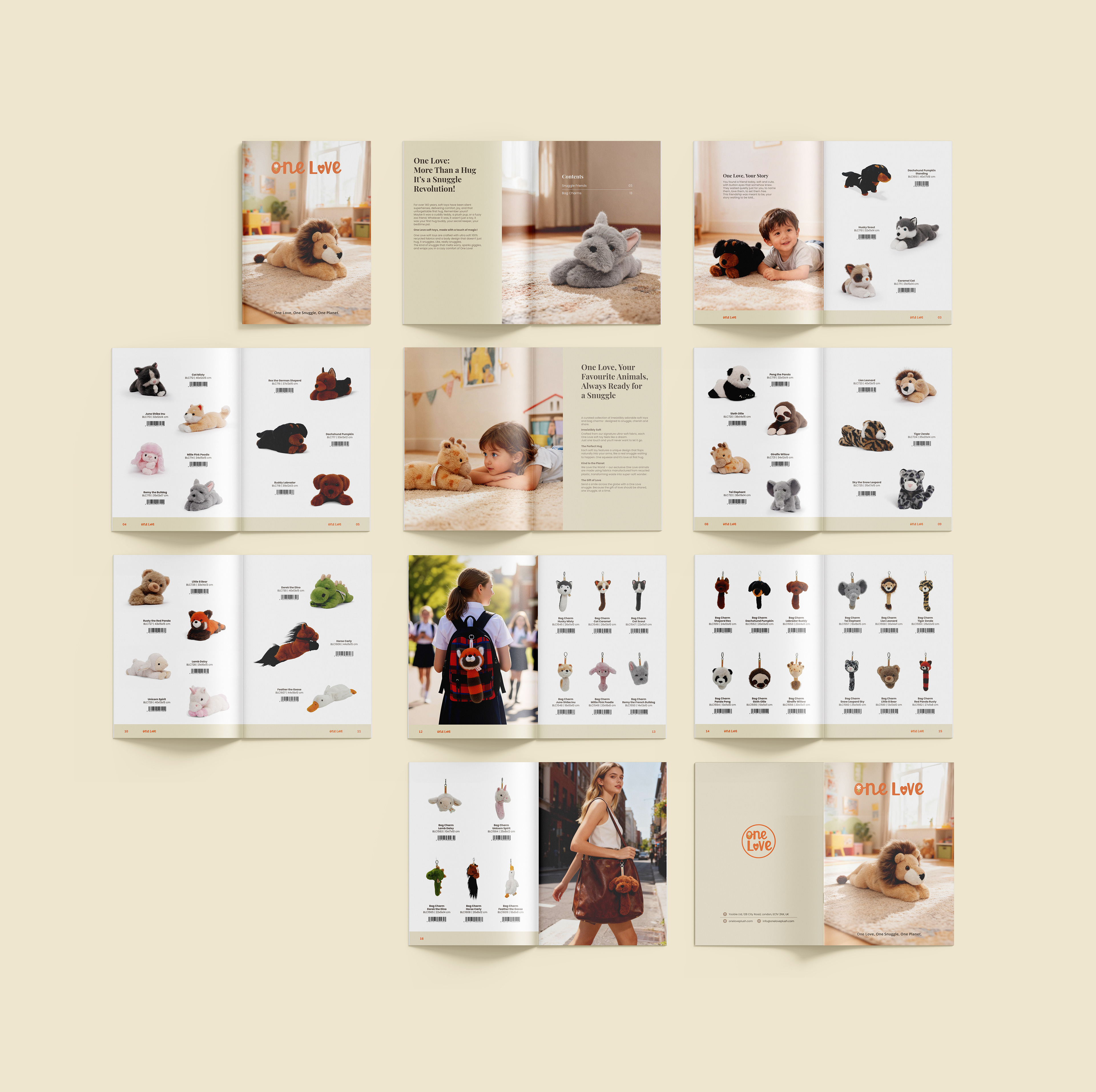 One Love è un’azienda londinese specializzata in soft toys e accessori per bambini. Mi è stato richiesto di progettare un catalogo prodotto di 20 pagine per presentare la nuova collezione in modo chiaro, piacevole e professionale.